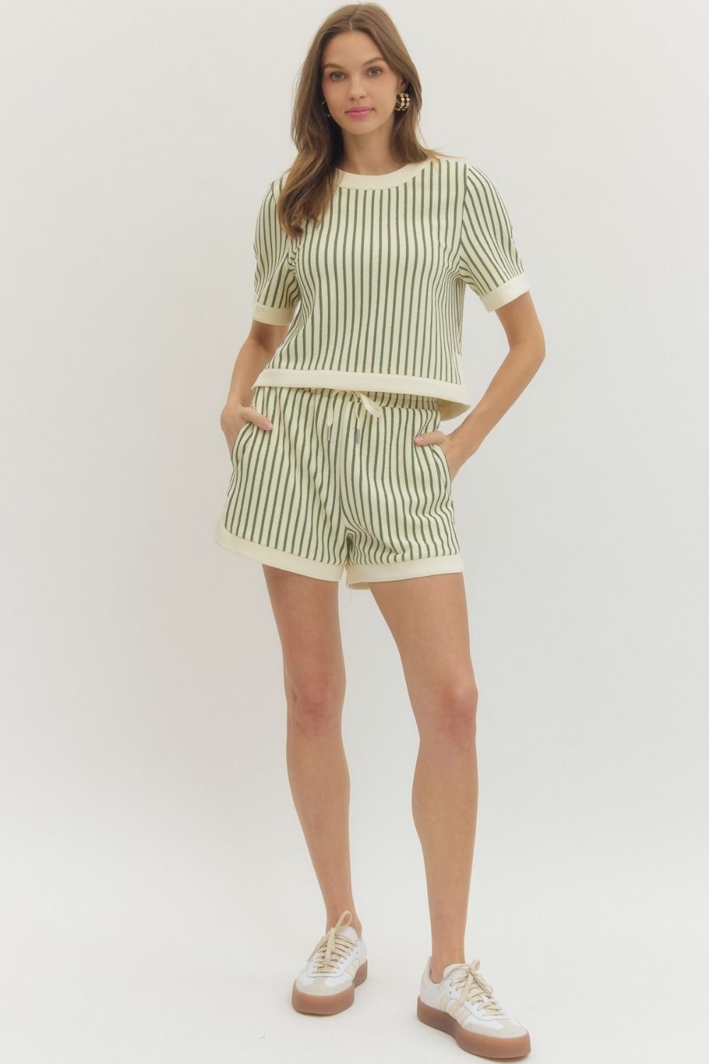 Marley Striped Set combines a classic striped short sleeve top with matching shorts for effortless coordination. The knit top features a round neckline with contrast trim detailing and a functional back button closure, while the shorts offer practical side pockets and an adjustable drawstring waist. Perfect for casual comfort and timeless style.