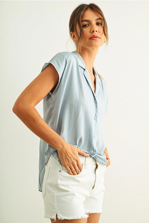 Slip into effortless elegance with the Mabel Silky Button-Up, your new go-to for looking put-together without trying too hard. This dreamy sky blue beauty features a flattering v-neck and charming cap sleeves that hit just right. The silky fabric drapes beautifully against your skin, making it perfect for everything from casual brunches to laid-back office days. Button up for polish, or leave it undone for that breezy, carefree vibe. A wardrobe essential that's as fun to wear as it is fabulous to look at.