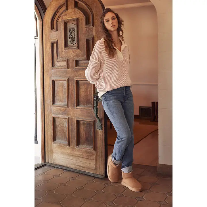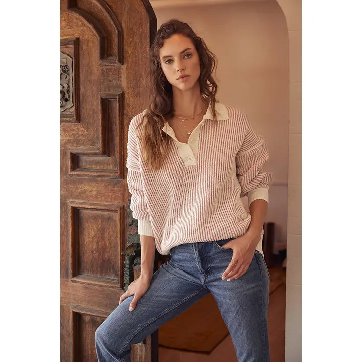 Classic with a twist—this Henley-style sweater top brings together timeless structure and cozy texture. The collared neckline and Henley button placket nod to tradition, while the two-tone textured stripe knit adds depth and visual interest. Soft to the touch and easy to style, this piece is perfect for layering into early fall and beyond. Whether tucked into tailored trousers or worn loose with relaxed denim, it adds an effortless polish to any outfit. A quietly elevated staple. Seasonless with just enough texture to keep it interesting.