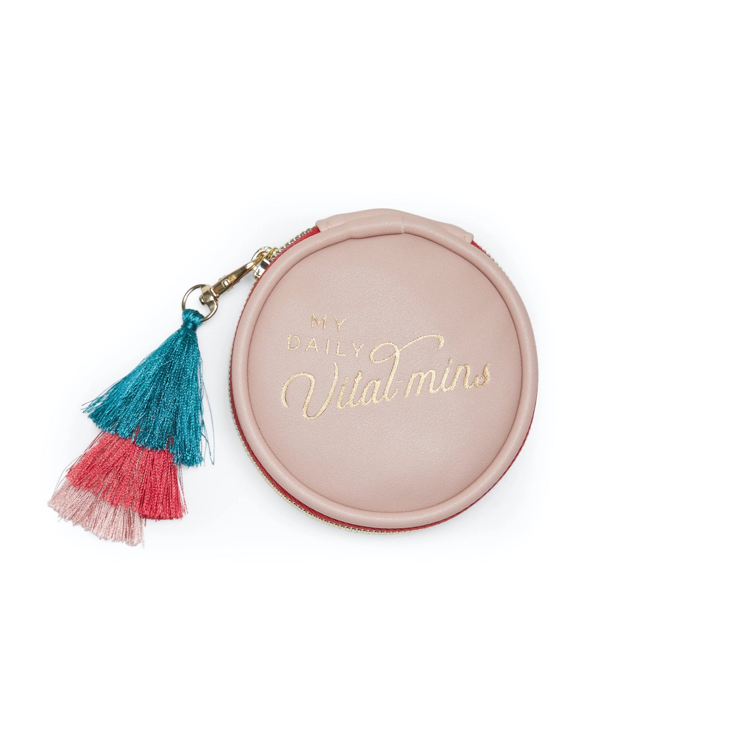 Keep your vitamins and supplements organized with these playful Vegan Leather Pill Boxes. Measuring 3.6" in diameter and 1" deep, they feature 7 compartments to separate your daily doses. The colorful removable tassels add a fun pop, while the printed fabric liner and metallic zipper keep everything stylish and secure.