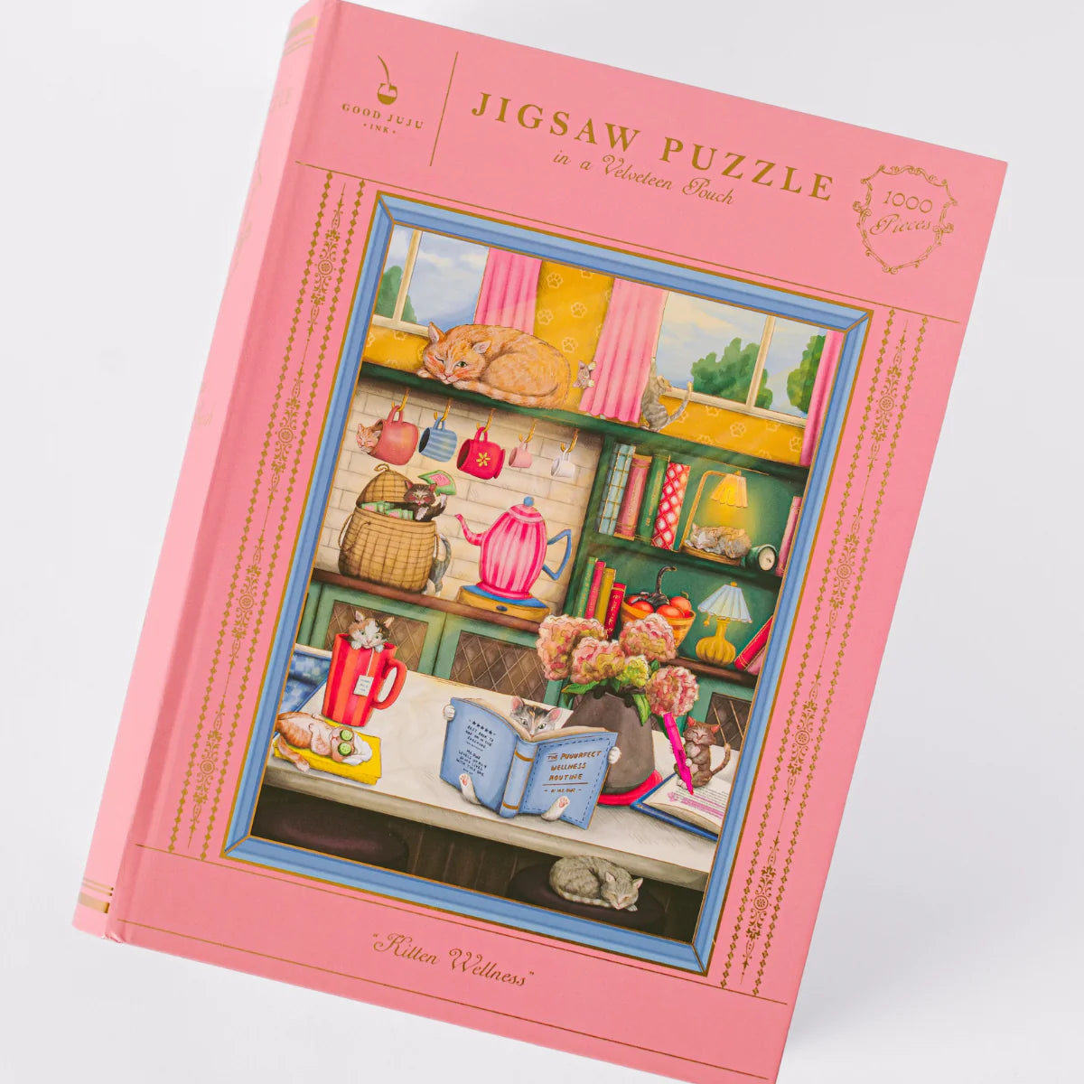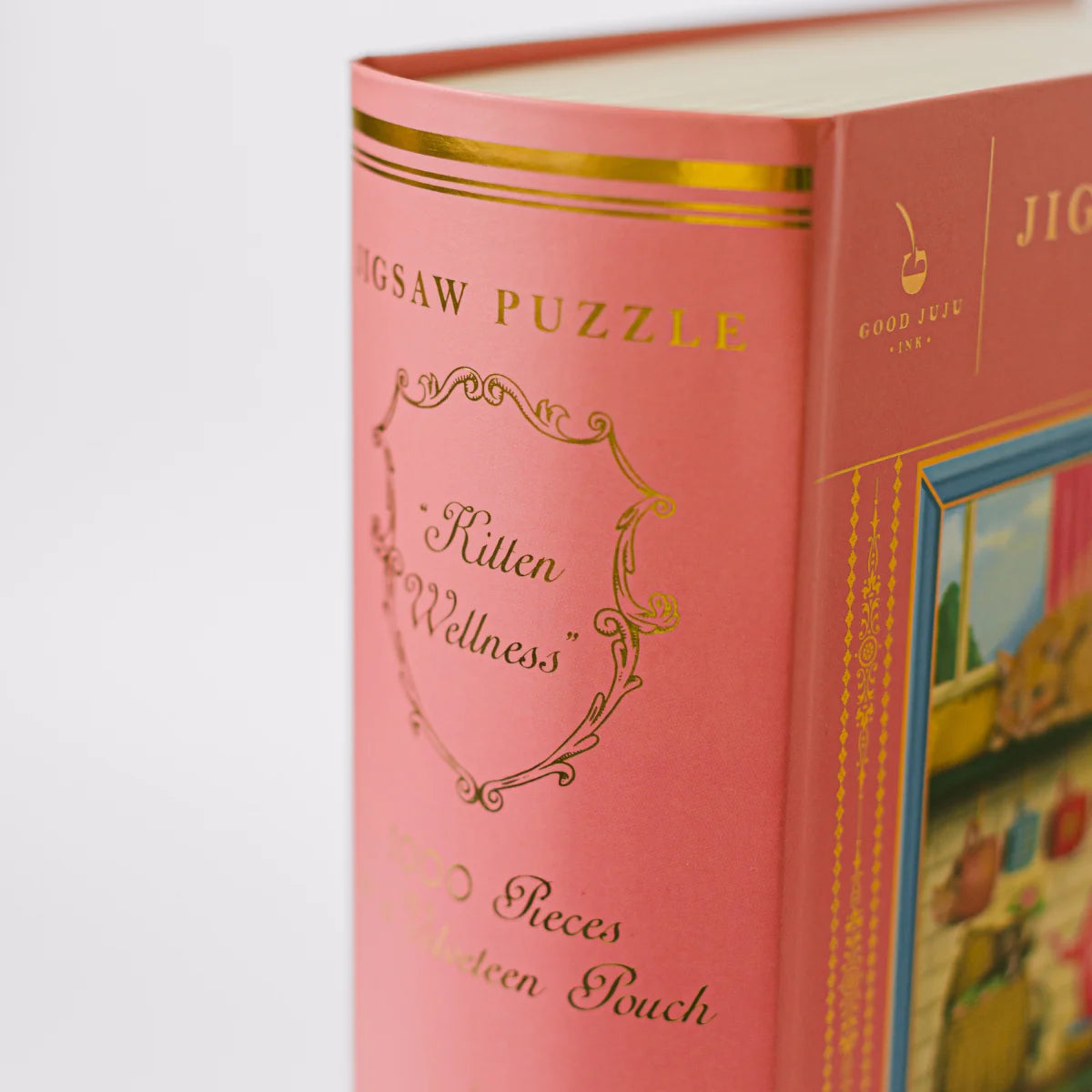 Meet your new cozy companions—an entire litter of curious kittens enjoying their wellness routine. Some read, some nap, others hide among teacups in this charming 1,000-piece puzzle full of detail and delight. With gold foil touches and a soft vintage palette, this puzzle feels like a storybook come to life.