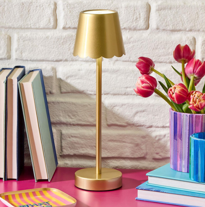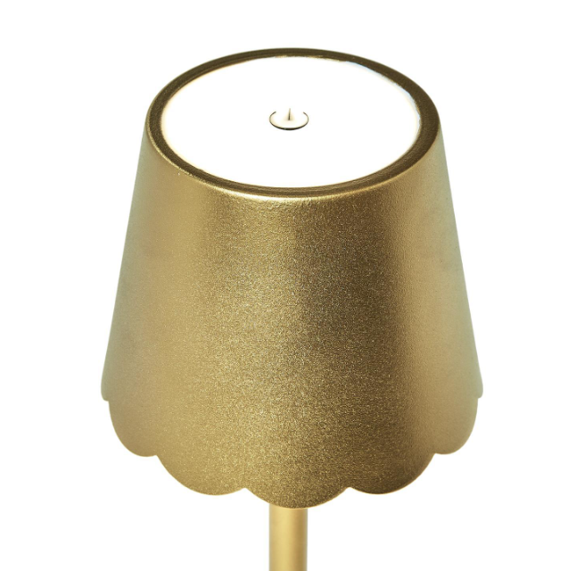 Create the perfect ambiance anywhere with this cordless, portable LED light. A touch button functionality makes it easy to switch between the three different light settings and dimmer function. Features a good metallic finish and scalloped edge shade. Customize further with our rattan shades!